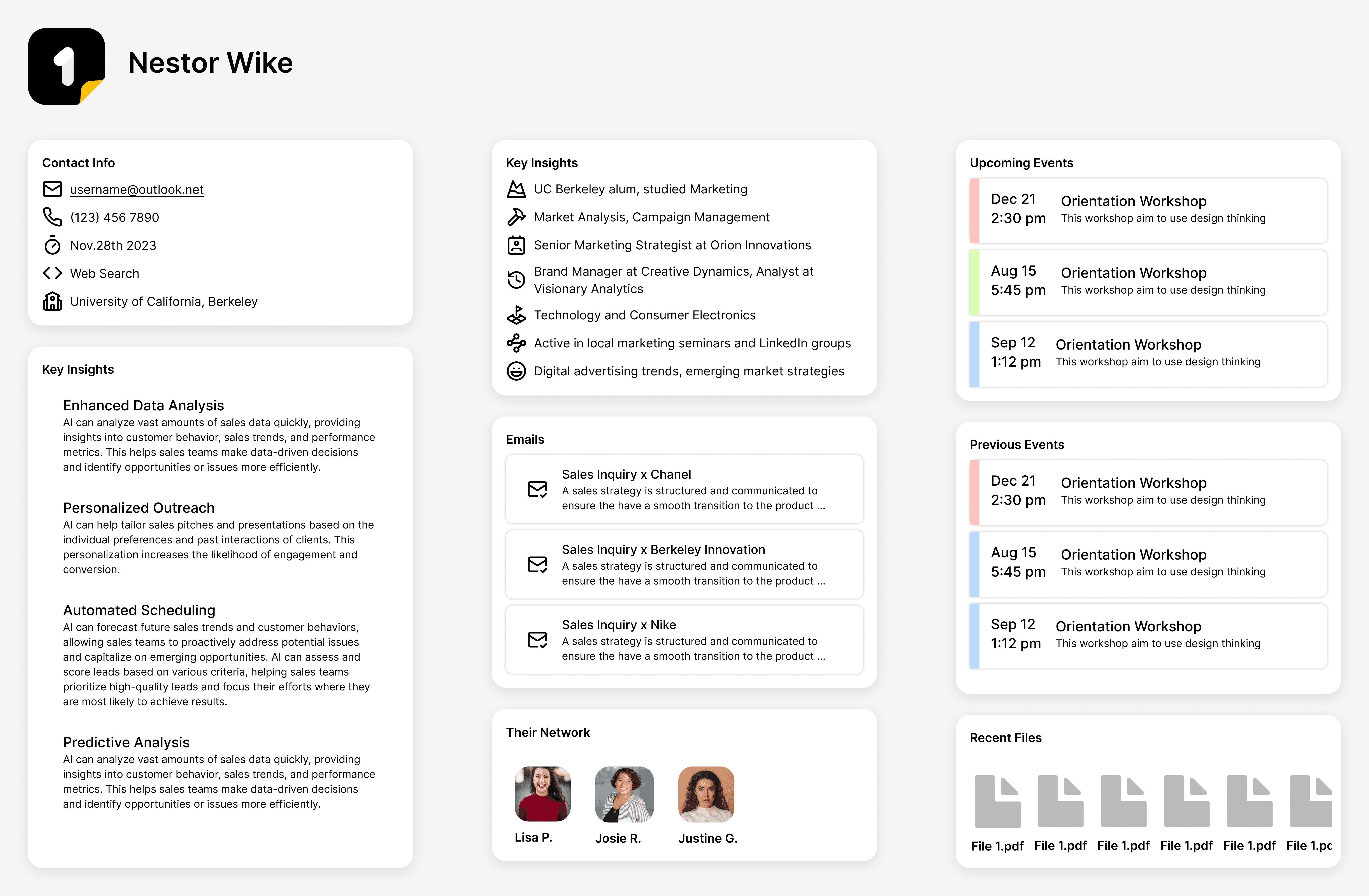 Centralizes contact information and insights from multiple platforms, providing an overview of each contact, including meeting details and key conversation takeaways to inform sales strategy.