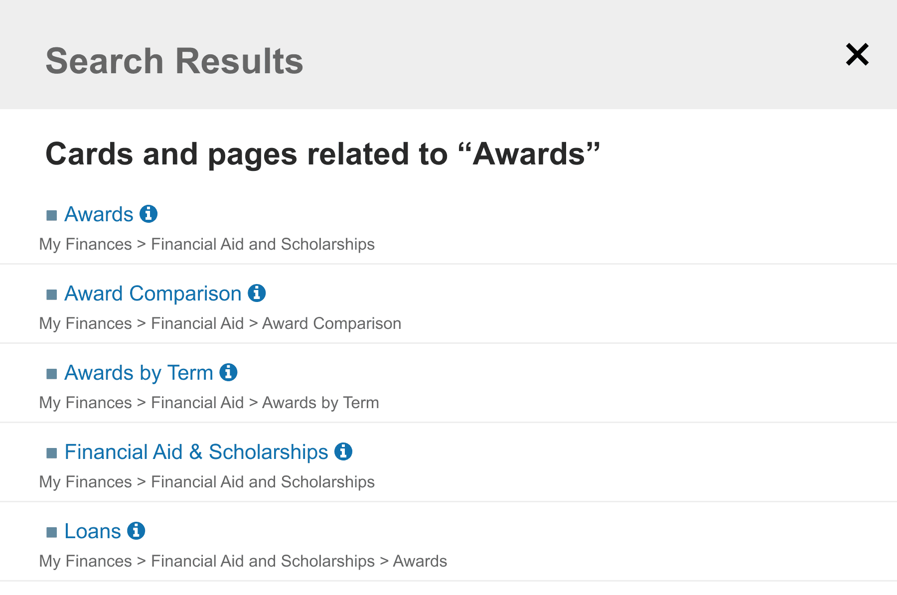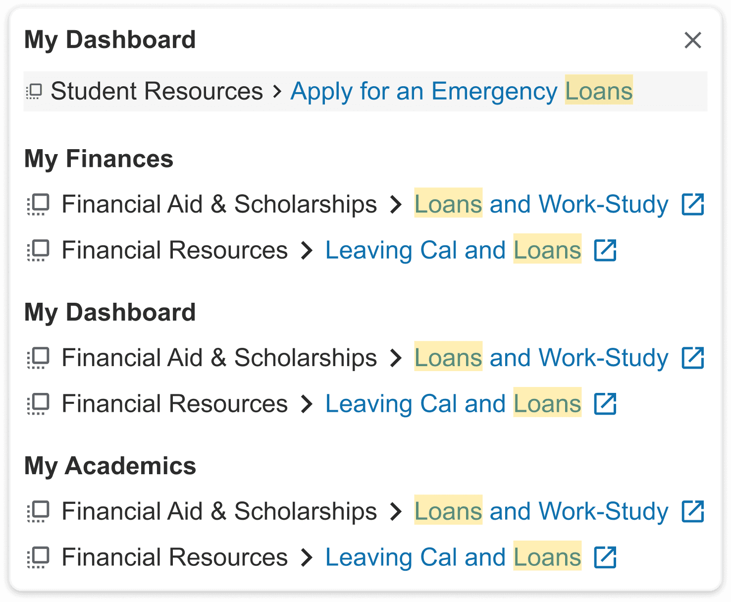 Clearly links search terms to results, giving students a predictable navigation path