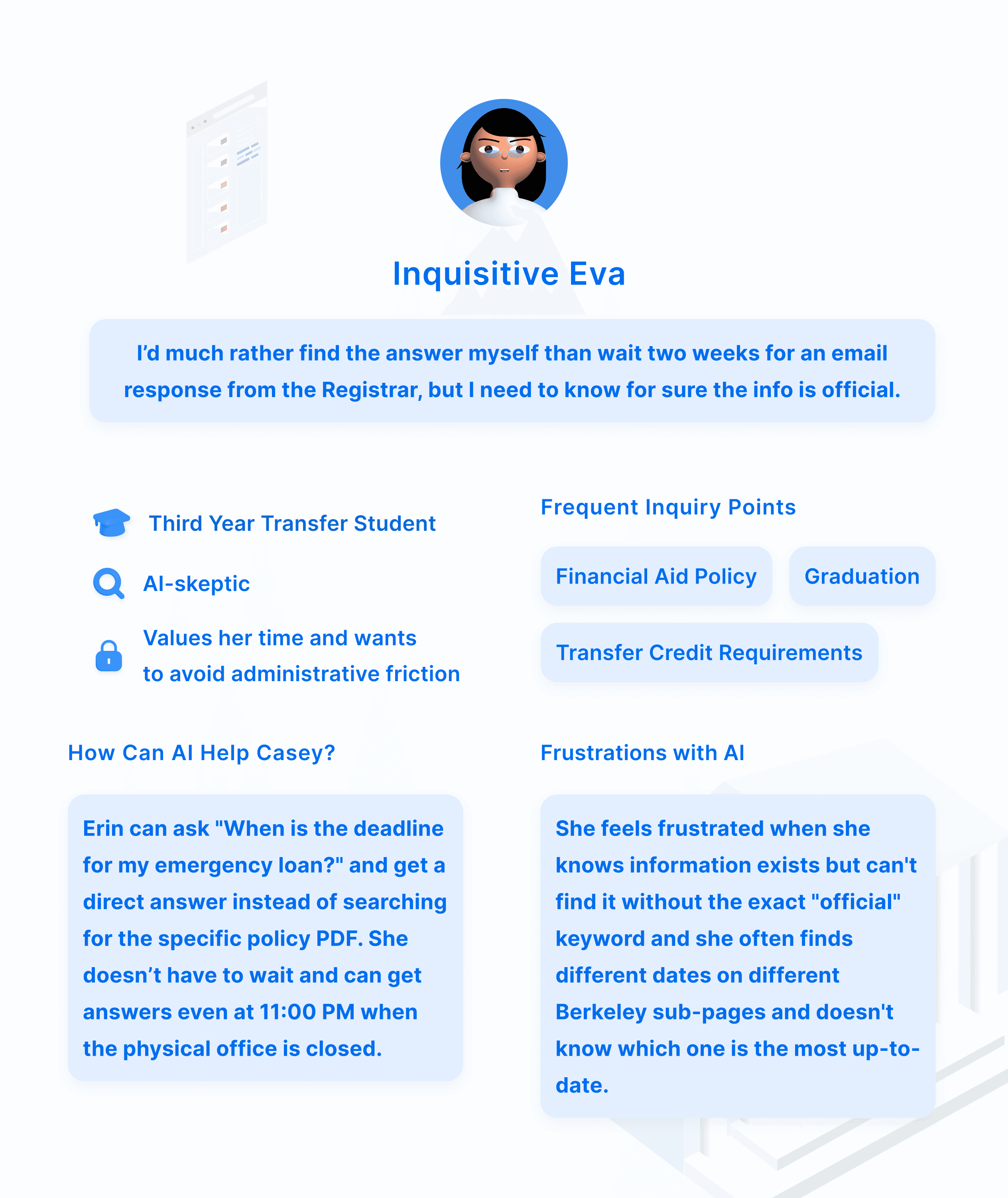 Eva represents a common Berkeley student archetype: busy, capable, and unfamiliar with institutional jargon. Through her needs, we observed that students and the university speak two different languages: students ask questions in plain English (“I’m sick, what do I do?”), while the university organizes information by official codes (“Medical Withdrawal Policy”), making the AI’s most important role not link retrieval but real-time translation of student intent into the correct campus answers.