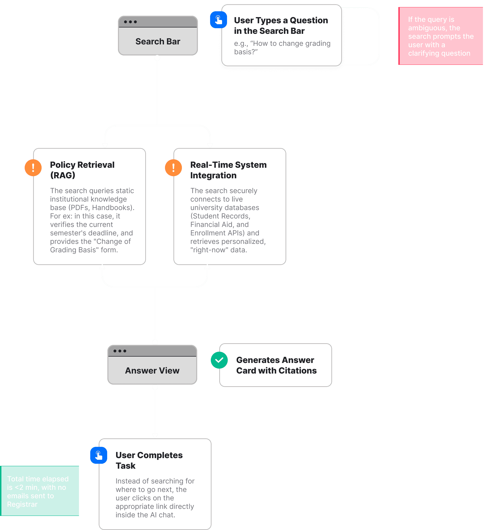 To avoid a “black box” experience, I designed the underlying system logic alongside the UI, ensuring responses were grounded in authoritative sources and clear next steps. The experience proactively handled ambiguous queries, routed requests through verified policy and student data sources, and surfaced contextual actions rather than isolated links, reducing dead ends and enabling students to resolve common issues quickly without staff intervention.