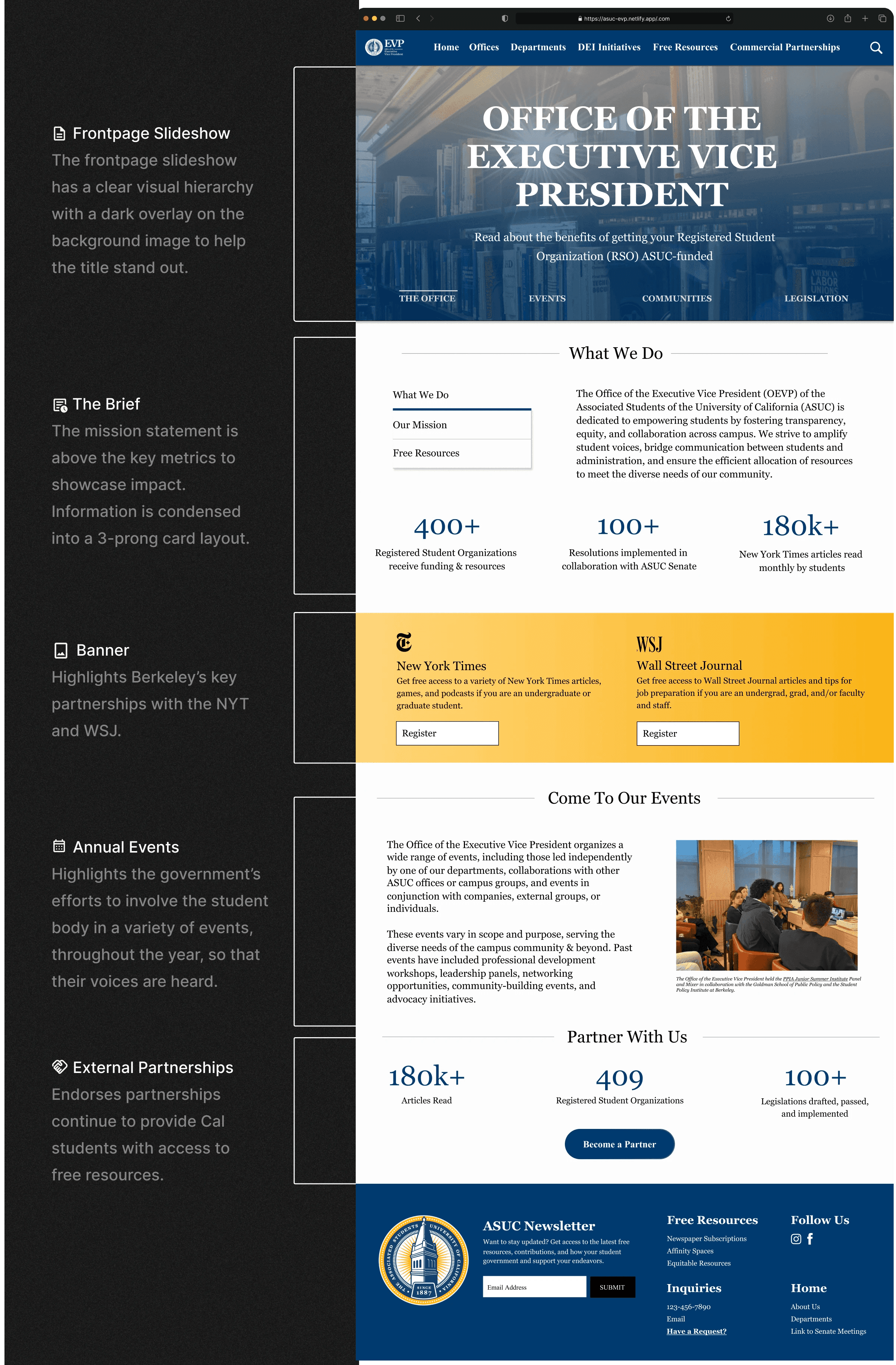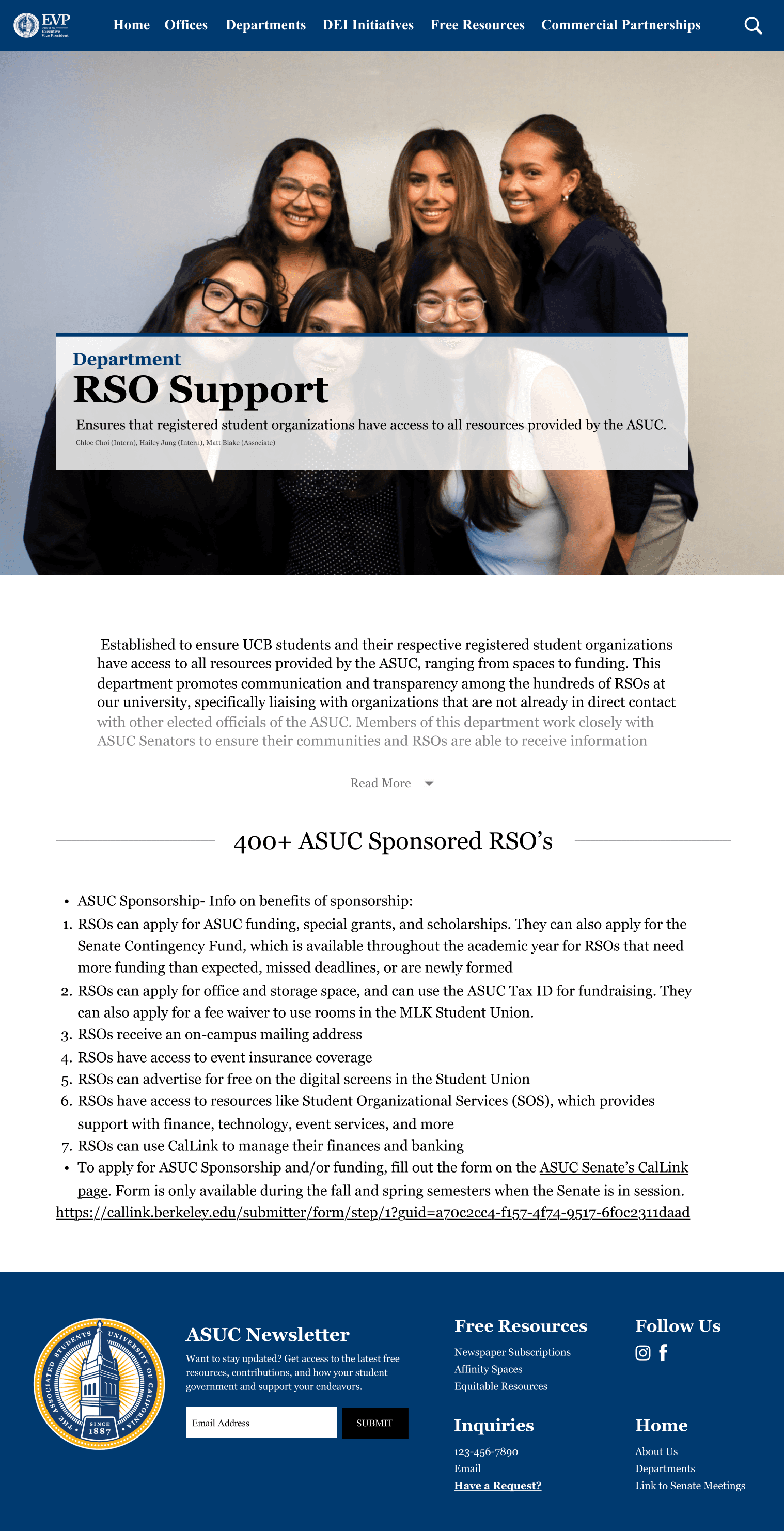 Similar to the RSO page, this section includes links to DECal courses, clubs, and other fairs happening throughout the semester, making it easy for students to stay informed and engaged. I also want to highlight the footer, which has a clear call to action to subscribe to the ASUC newsletter on Substack, keeping students updated on events.
