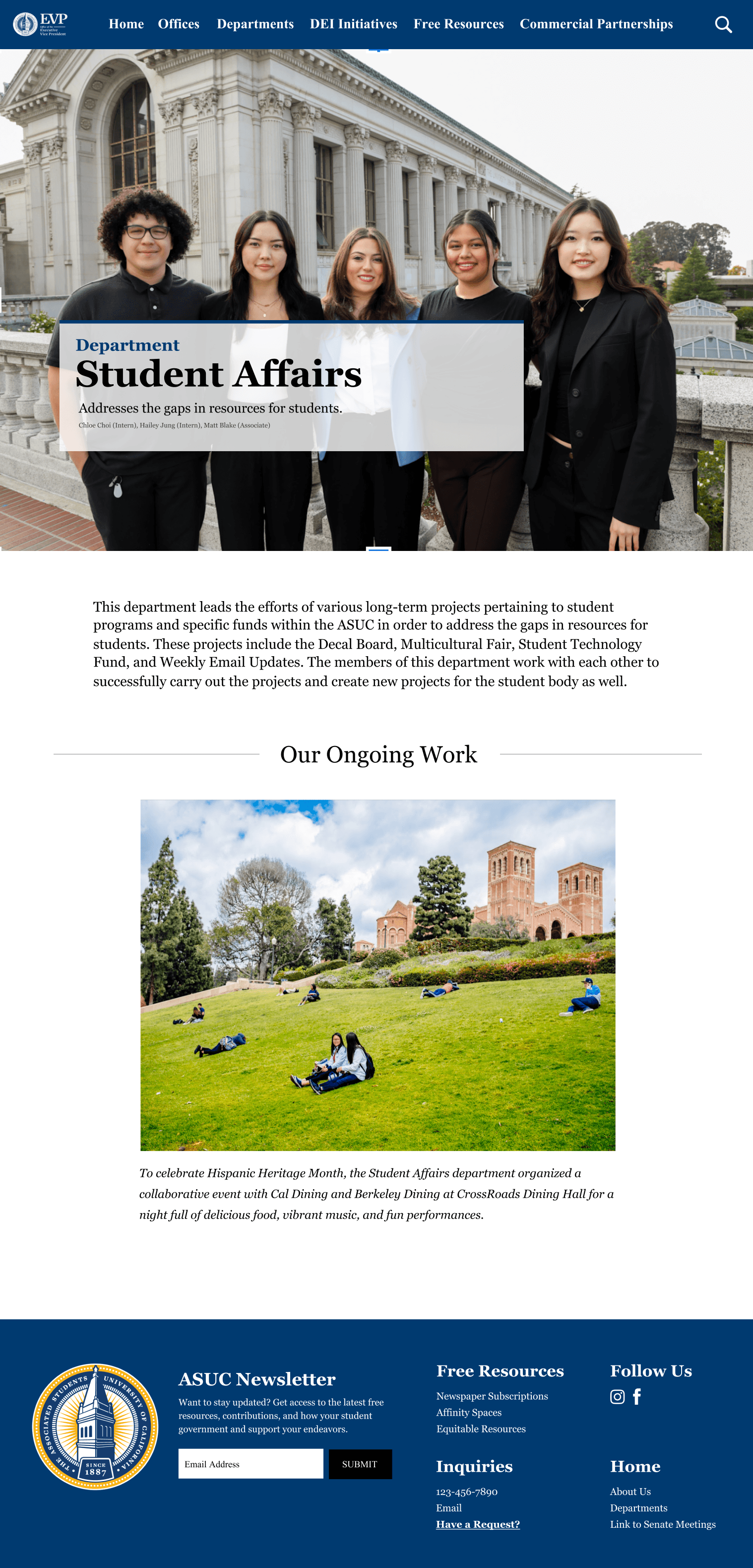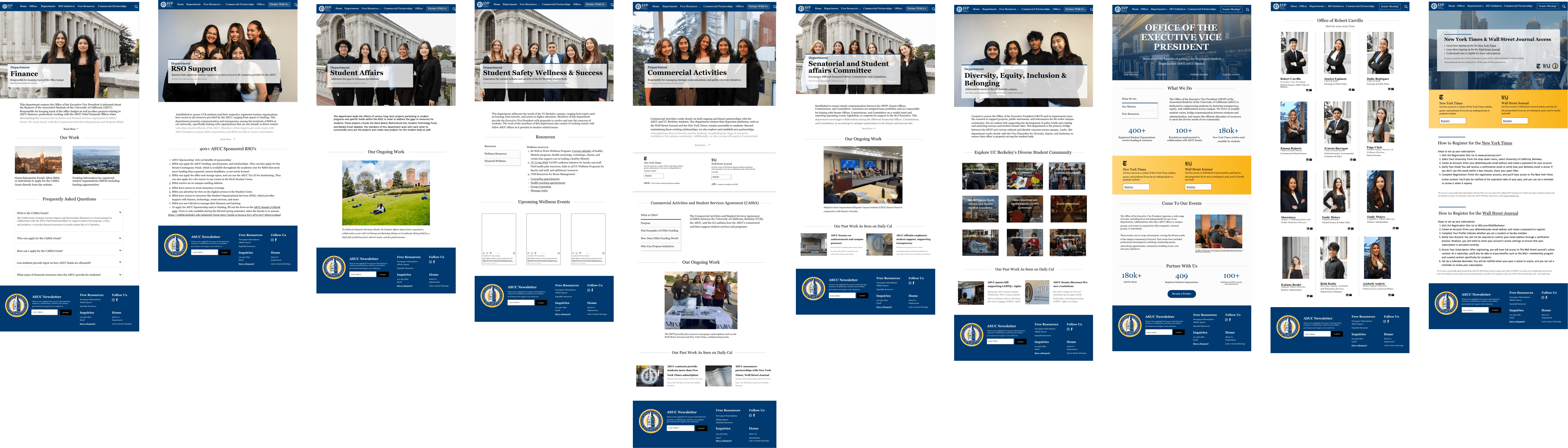 While I designed several other department pages, I chose to highlight these two to showcase the visual hierarchy, with a white banner that maintains information structure through the heading, subheading, and the intern details below. This consistent layout throughout the website ensures users know exactly what to expect and helps create a seamless experience.