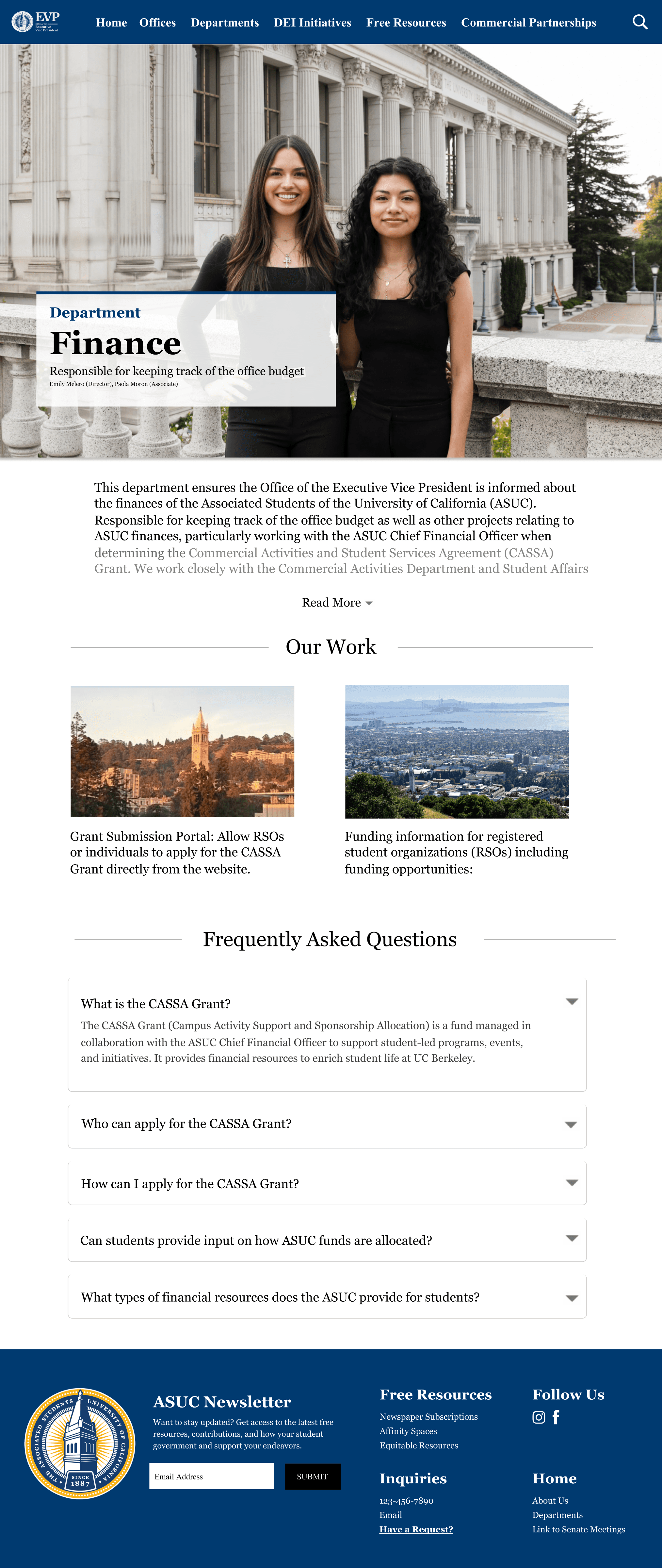 I followed visual hierarchy principles when designing the main heading, with supporting subtext clearly explaining the department's role. The "Our Work" section uses a card layout for organized content, and the "Read More" button provides a clear call-to-action while reducing clutter.