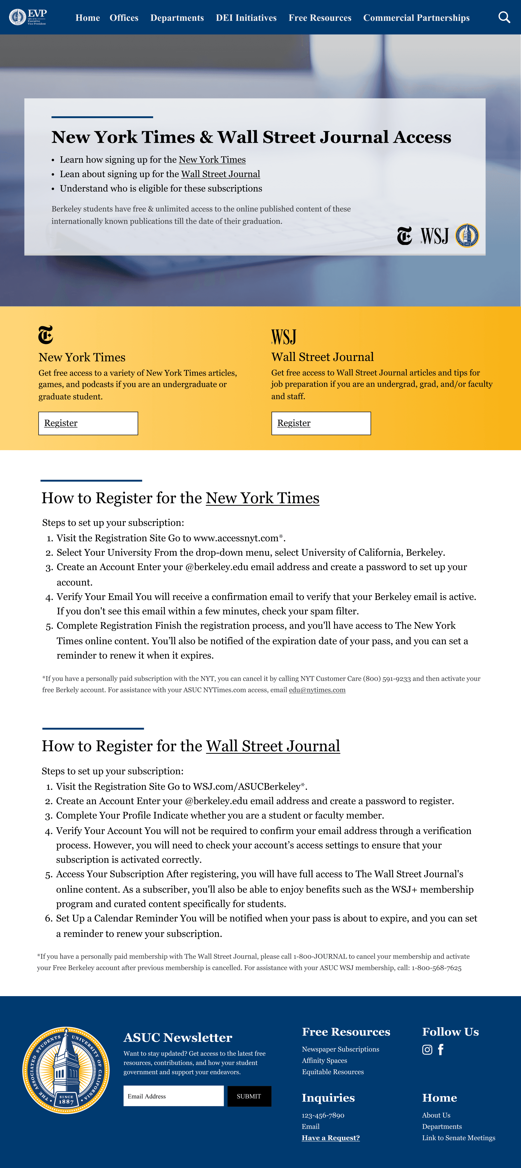 I created two distinct sections for NYT and WSJ with a balanced layout, giving special attention to the registration buttons. Important eligibility information is highlighted at the top, and ample whitespace is used to keep the design clean and minimal, while incorporating our blue and gold brand identity throughout the webpage.